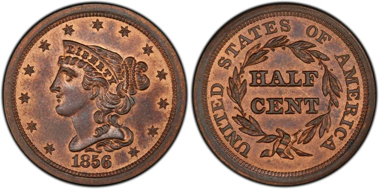 The 1856 Half Cent represents the final year of regular production for this denomination. Half Cents were first minted in 1793 and were the smallest denomination coin produced by the United States Mint. The 1856 issue features the Braided Hair design, which was introduced in 1840 and continued until the denomination’s discontinuation.