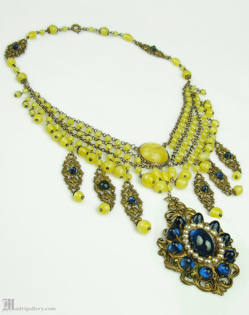 This Egyptian-style necklace was made for Giuseppe Verdi’s Opera Aida at La Scala. It’s a brilliant example of costume jewelry that has an amazing history. Although it’s made with brass and glass gems to mimic real gemstones and gold, it still has a relatively high value. The Corbella atelier made a lot of costume jewelry for operas, so keep an eye out for the name.