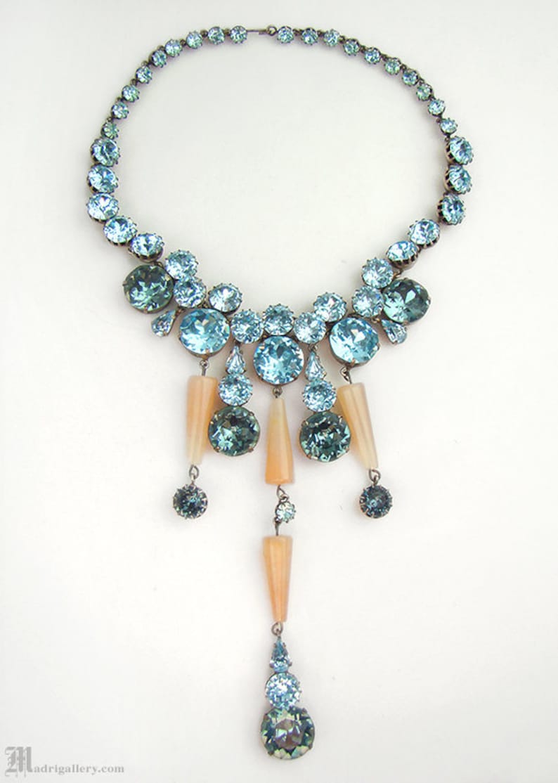 This brightly colored necklace has a style that dates back to the early 20th century, right as the art deco era sparked to life. It’s made with a silver alloy metal, which has patinated over the years, and brightly colored aqua crystals – a type of quartz that’s a much more affordable alternative to the likes of diamonds and sapphires.